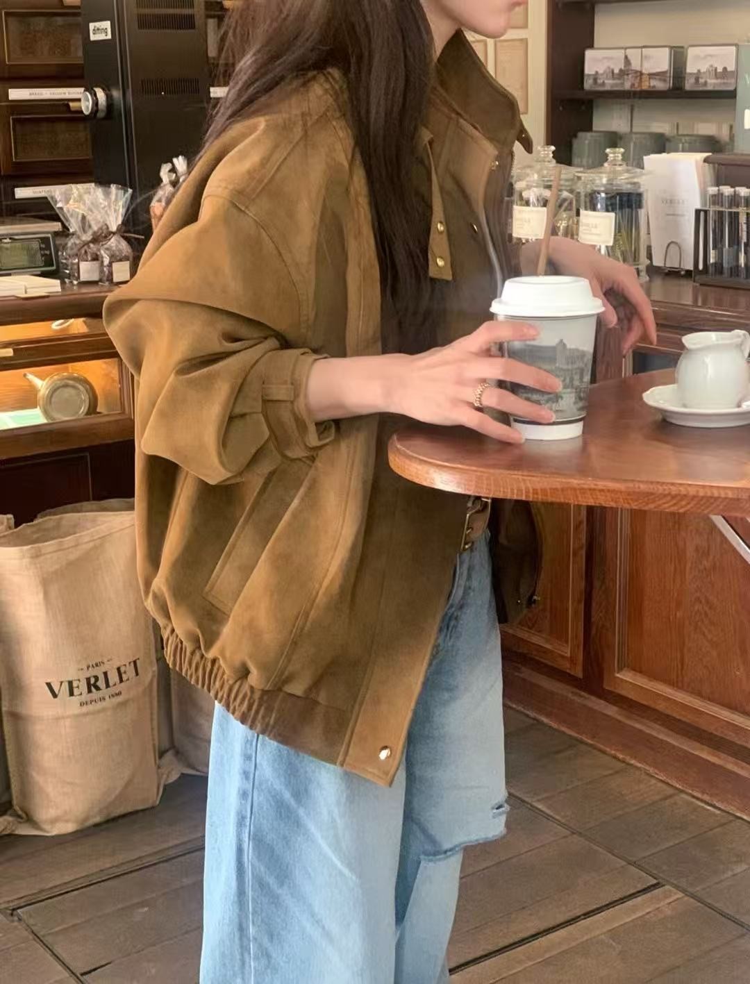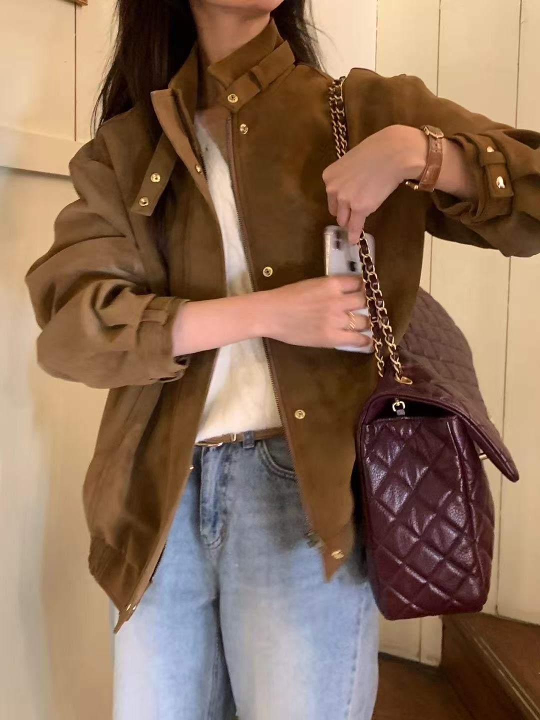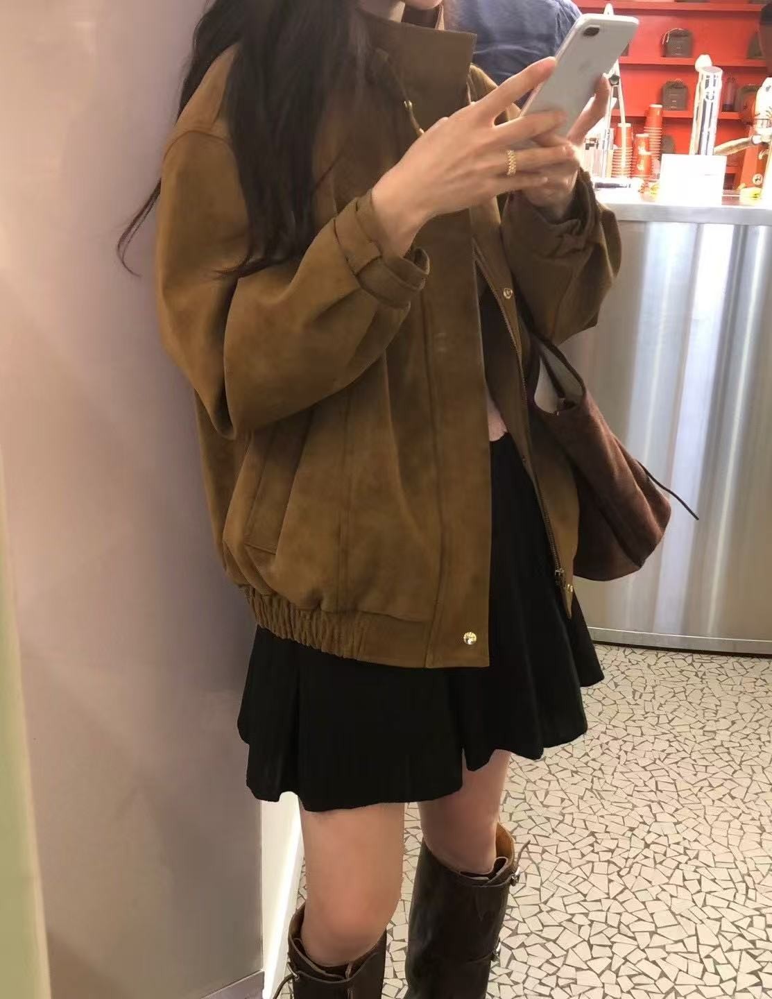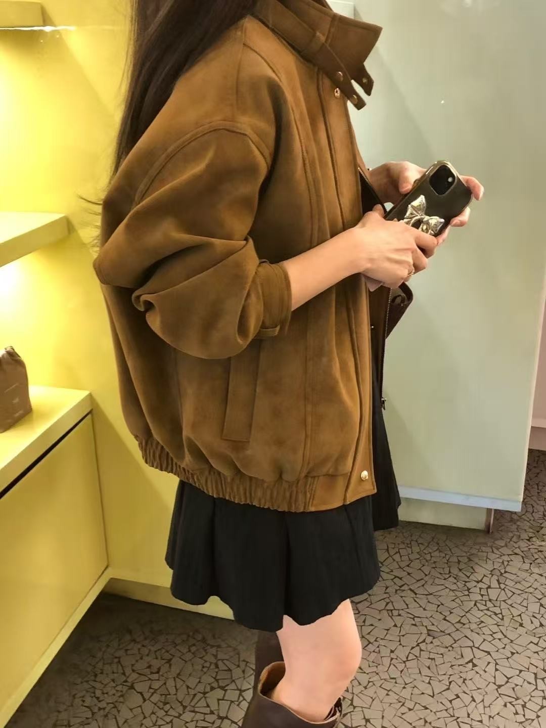 韩国女装 代购 OBJET 2025早秋新款 酷飒立领麂皮机车夹克短外套