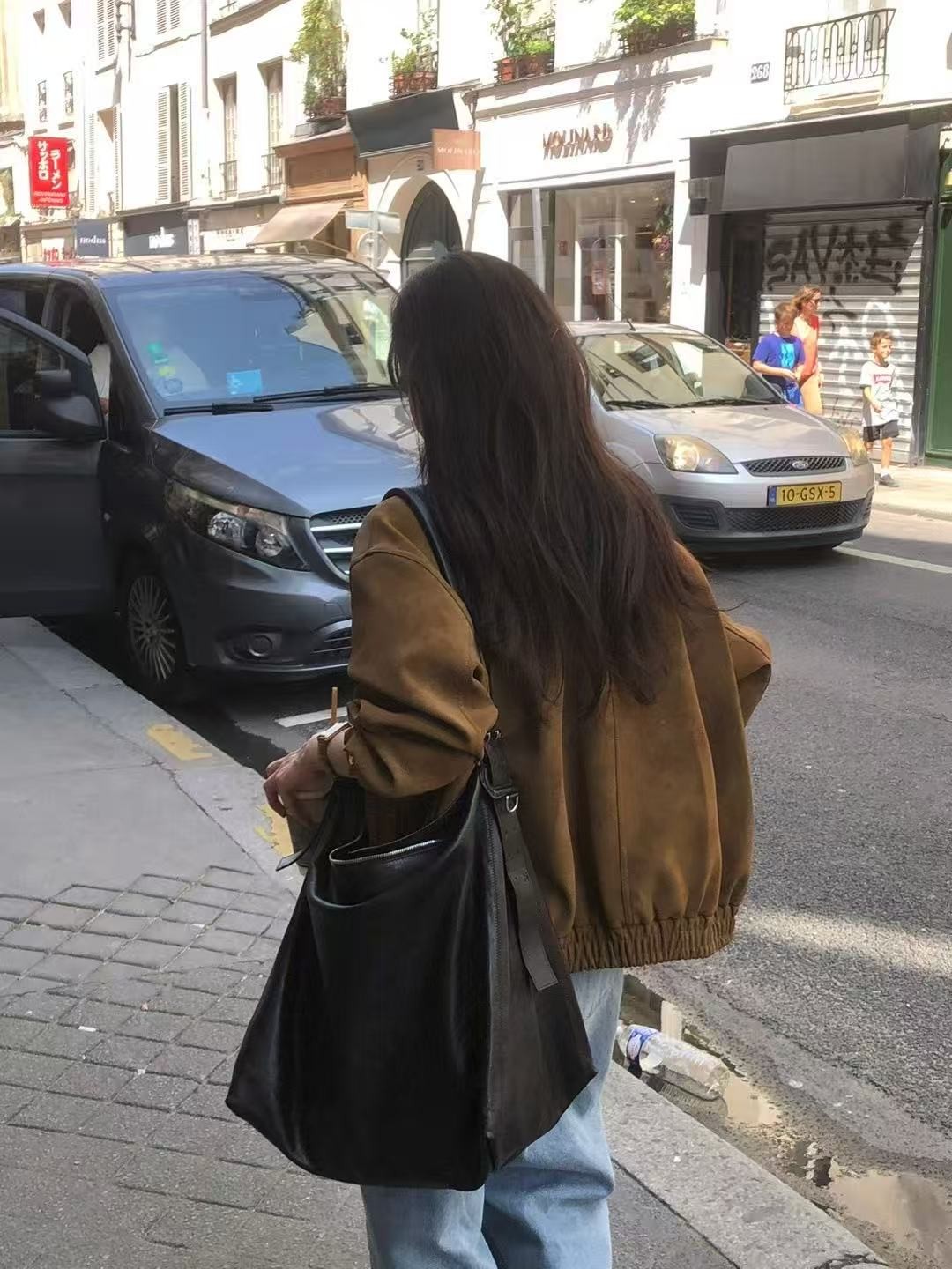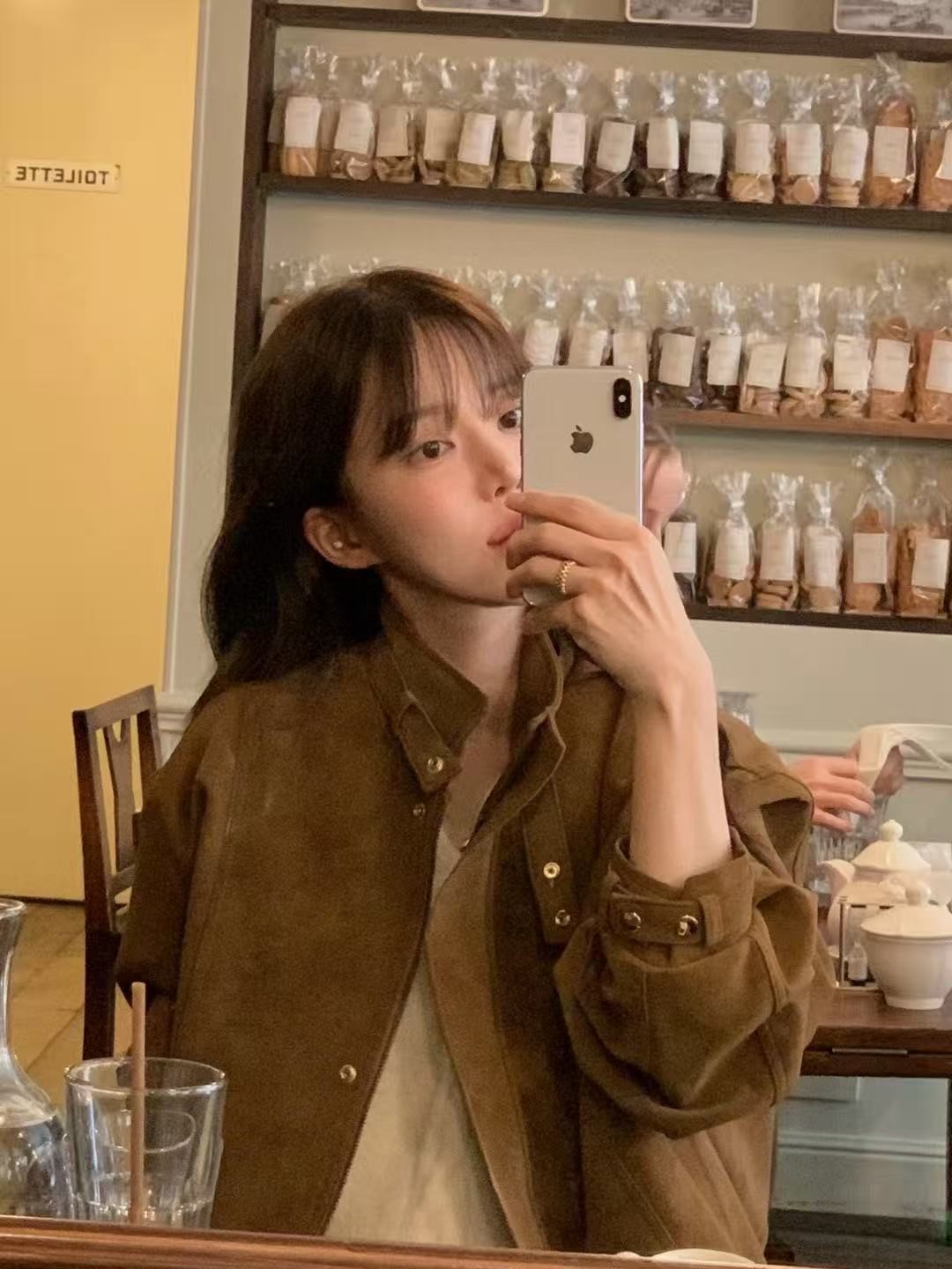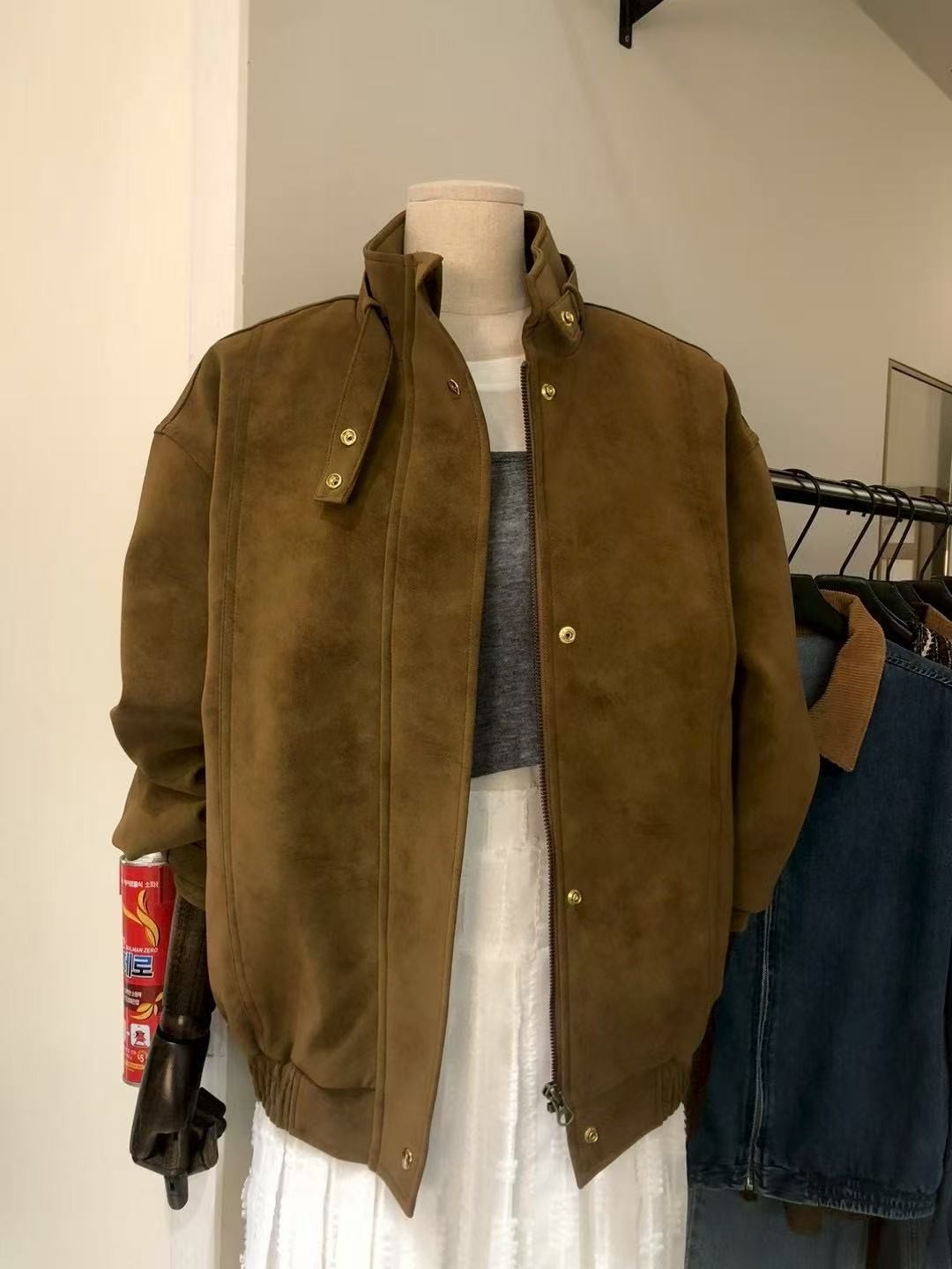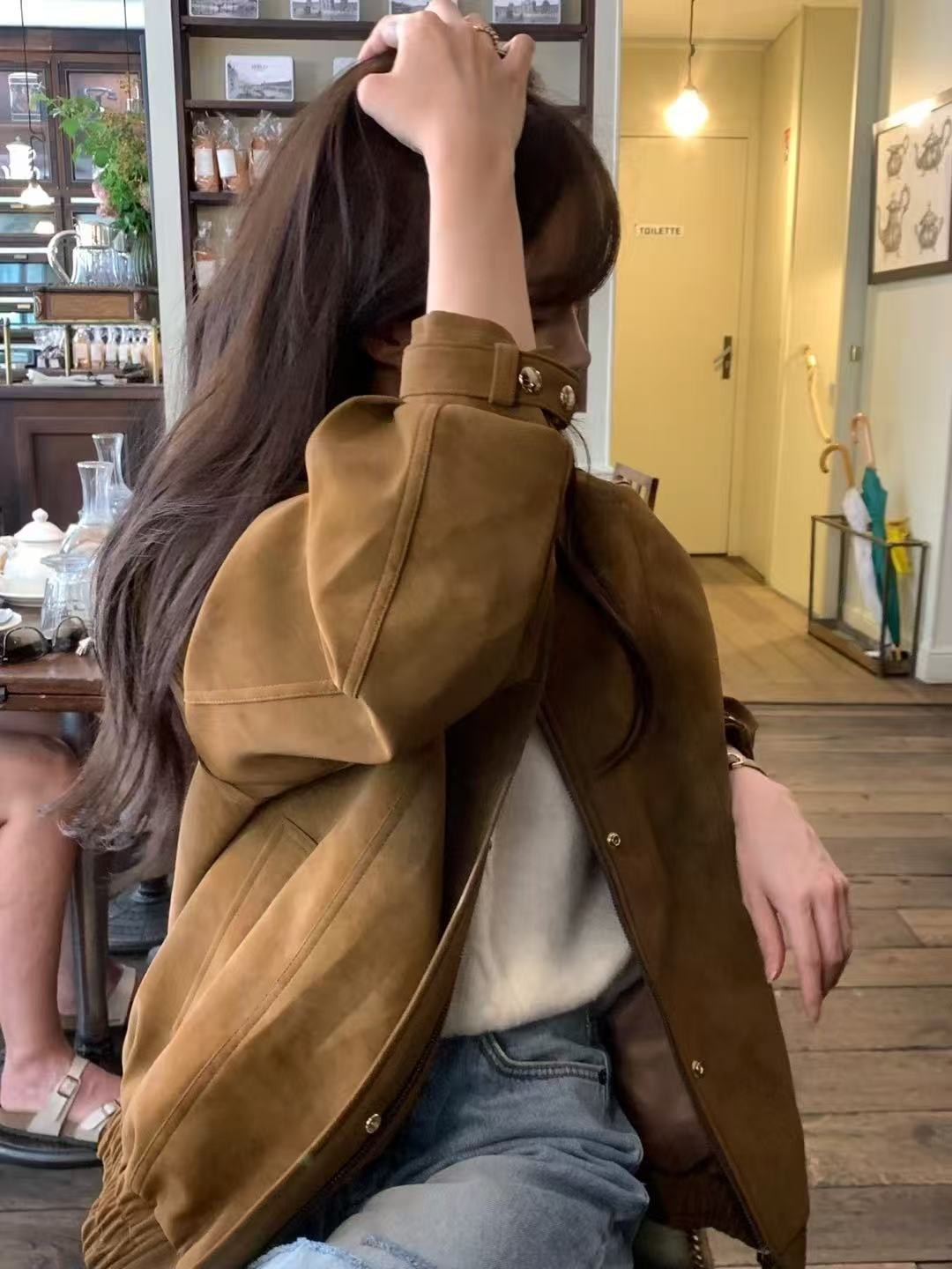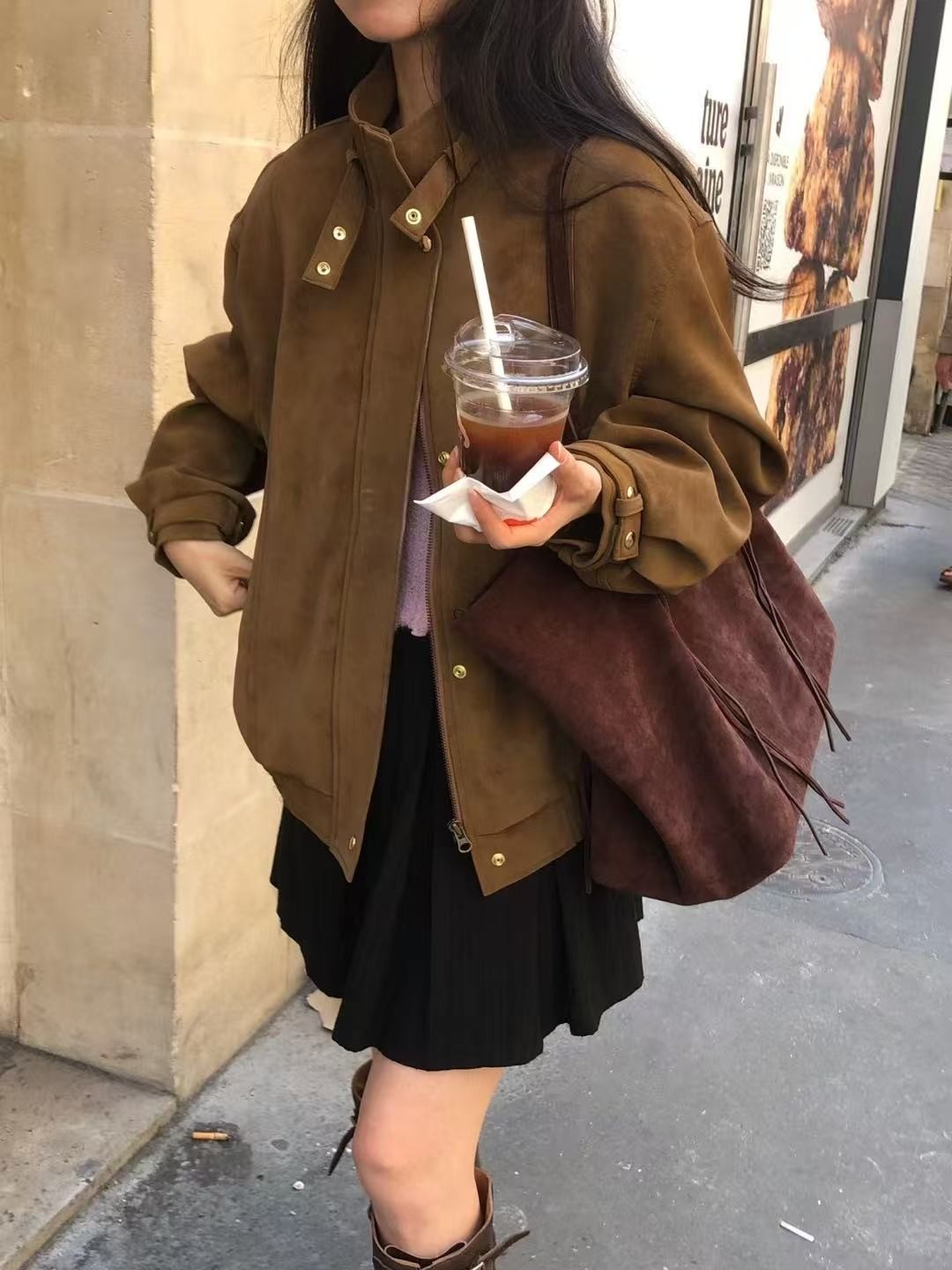 韩国女装 代购 OBJET 2025早秋新款 酷飒立领麂皮机车夹克短外套
