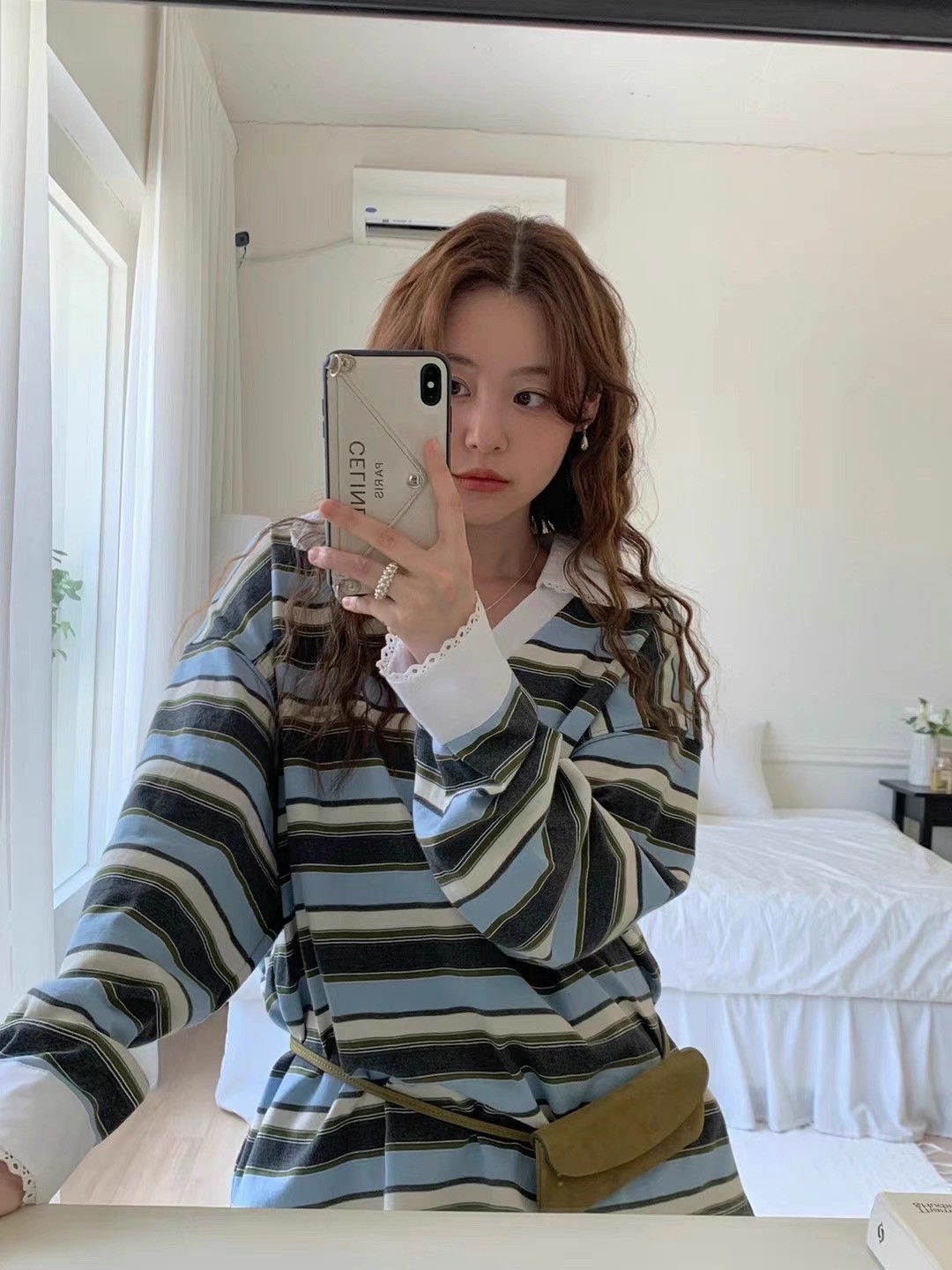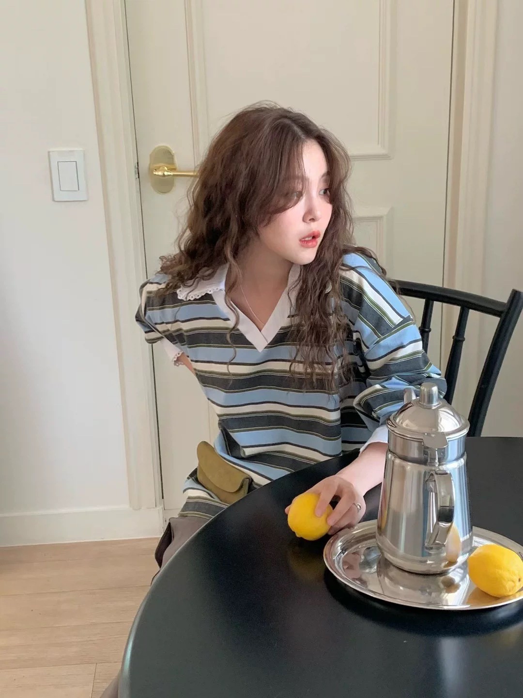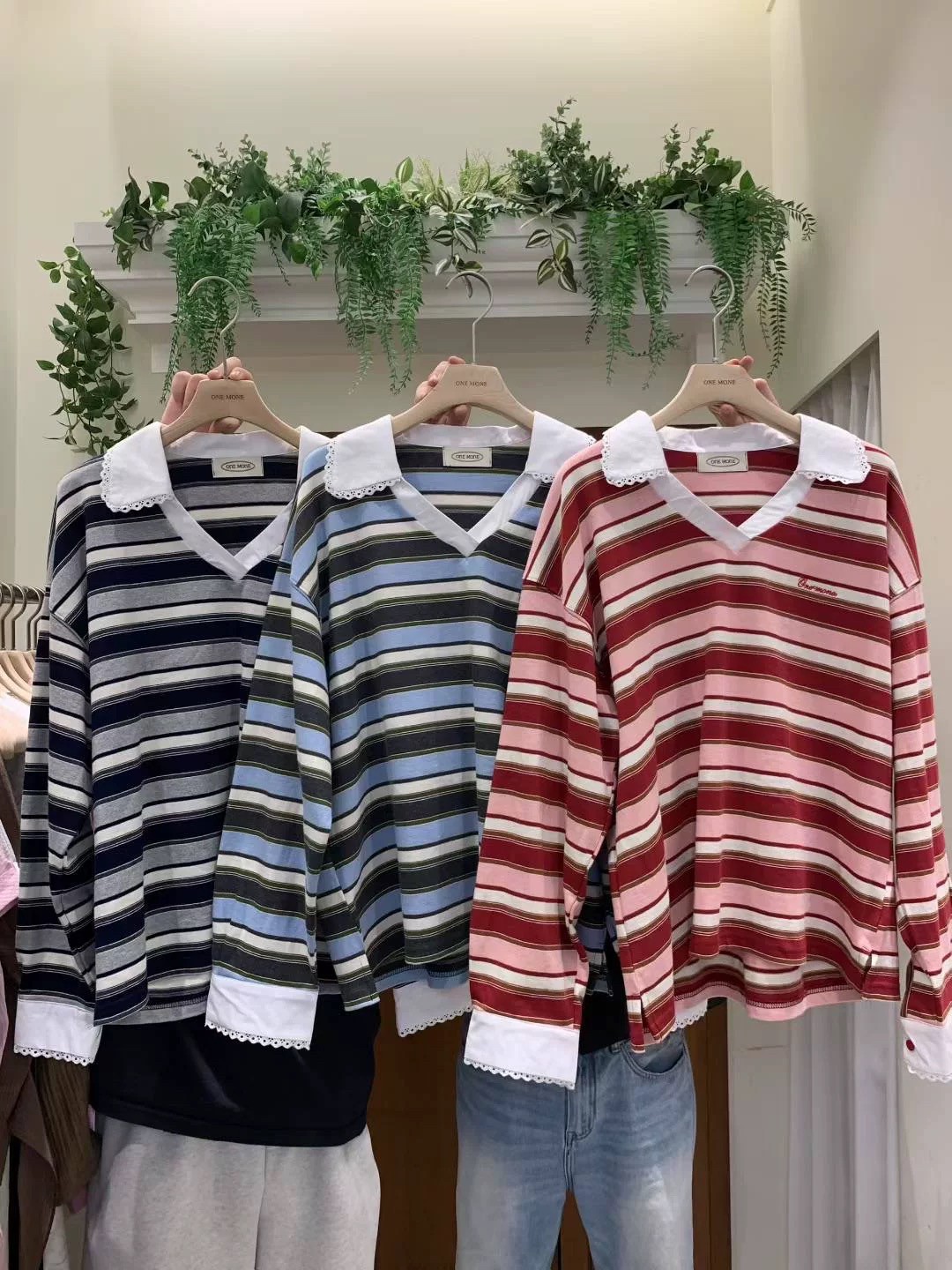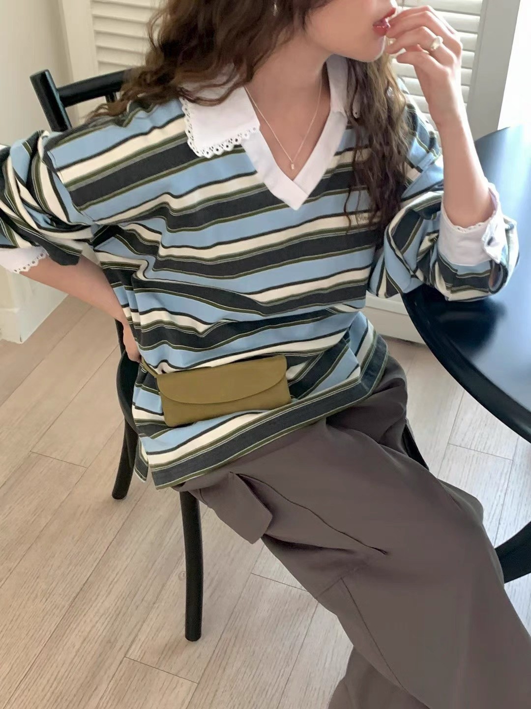 韩国女装 代购 one mone 25fw洋气百搭翻领条纹长袖t恤