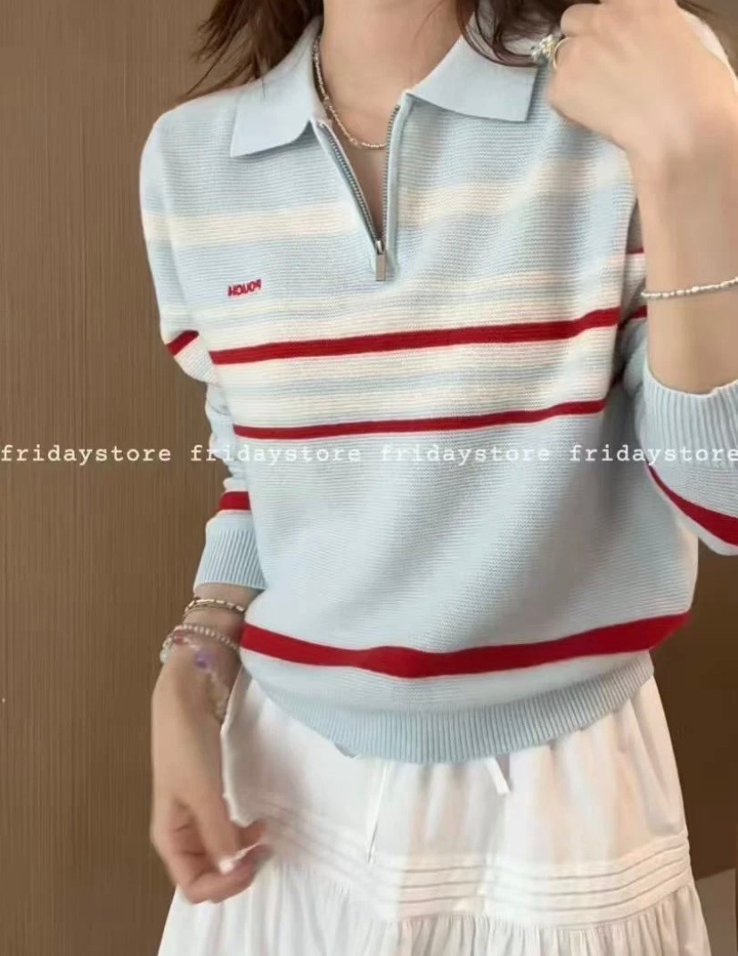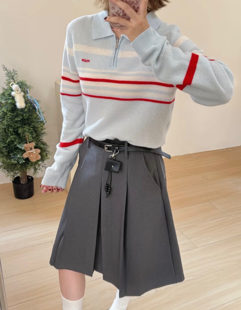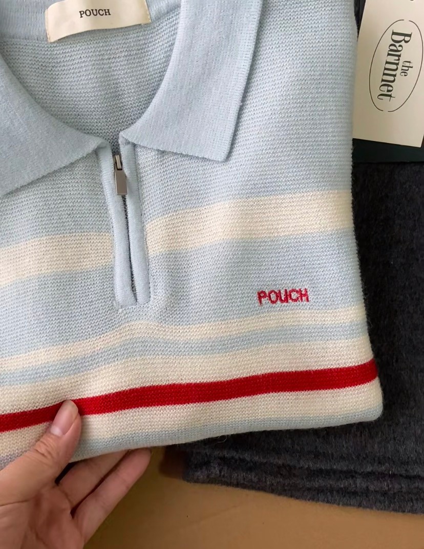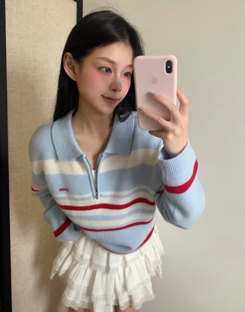 韩国女装 pouch 半拉链 翻领 长袖 针织 羊毛衫 胸围100cm 衣长56cm