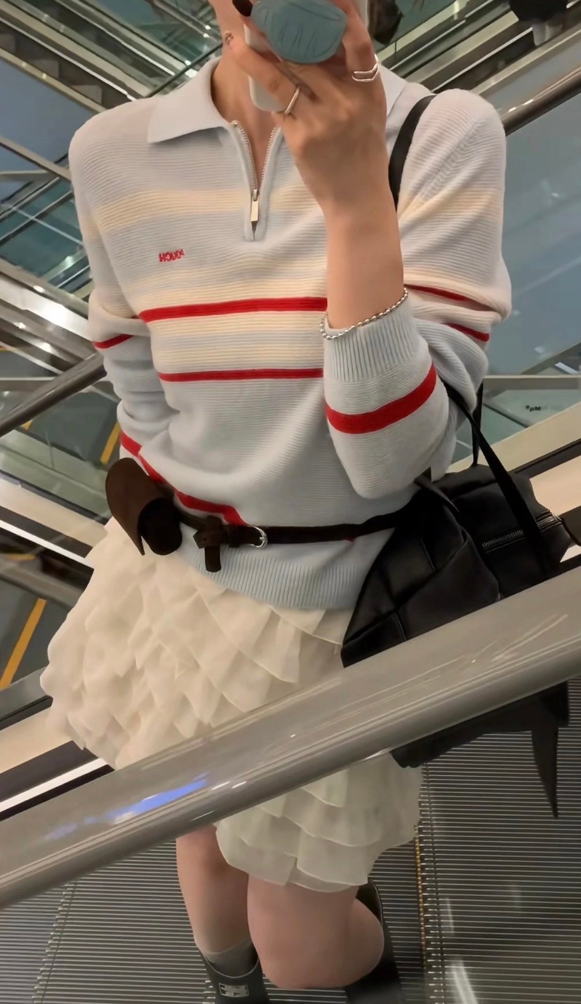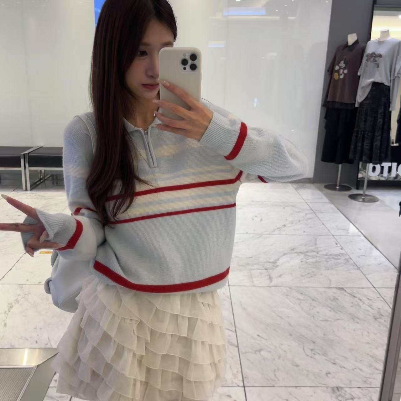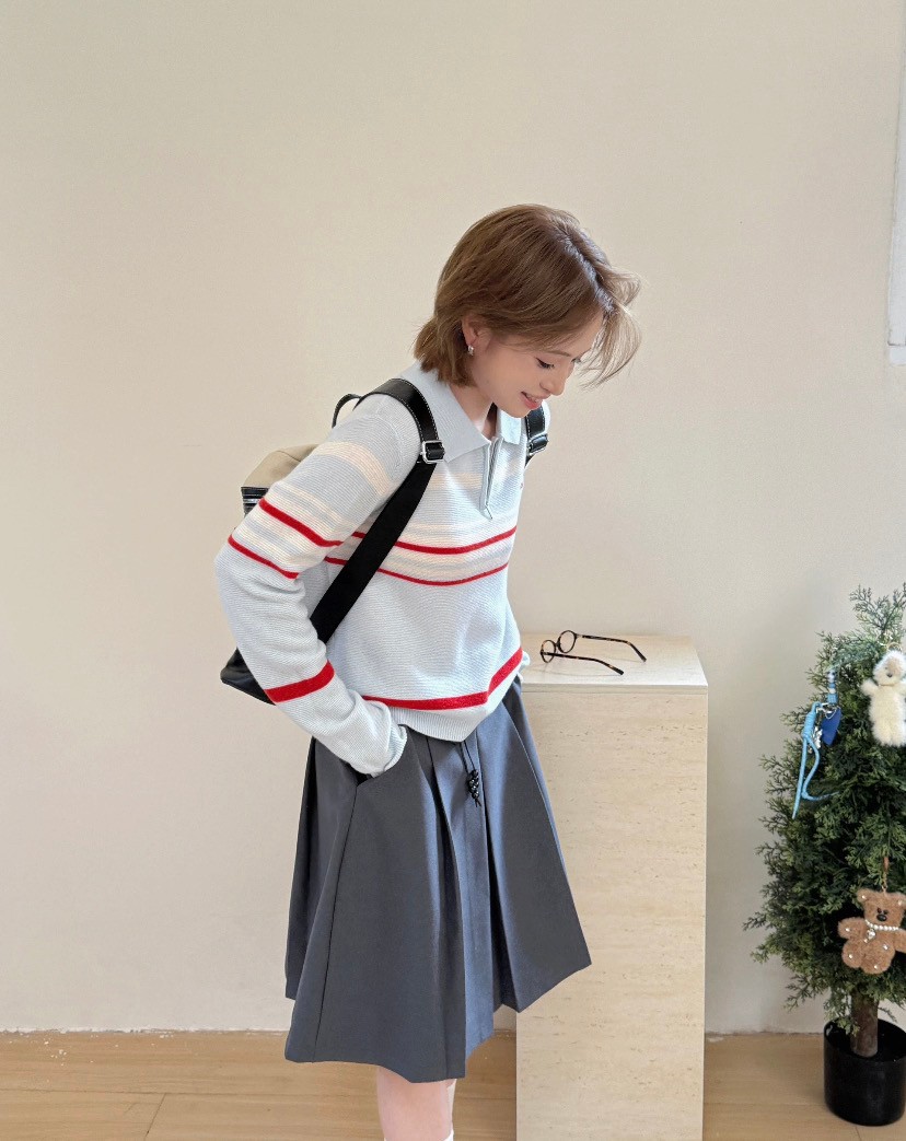 韩国女装 pouch 半拉链 翻领 长袖 针织 羊毛衫 胸围100cm 衣长56cm